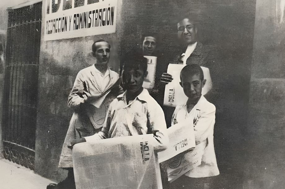 Una foto tomada en la puerta de la logia, en la calle San José con varios eldenses sosteniendo el semanario «Idella», que fue editado entre 1926 y 1930.